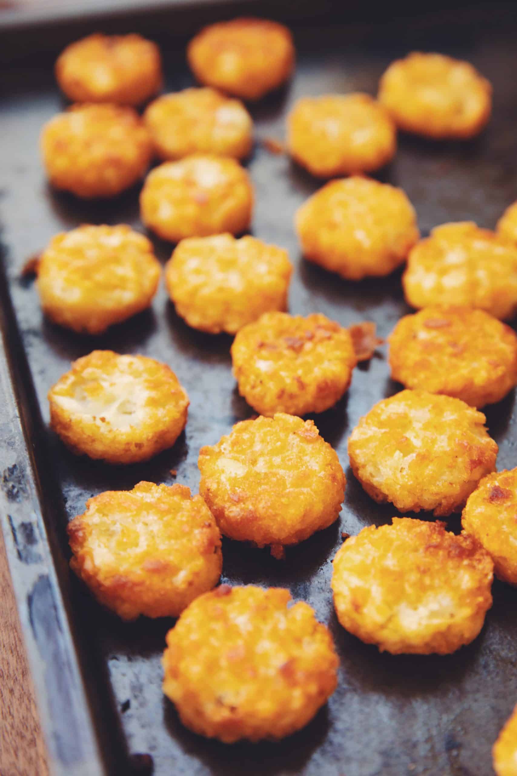 - Bake the tater tots on a large baking sheet for 25 minutes in an oven preheated to 425°F until golden brown and crispy.