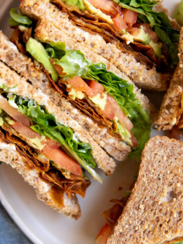 It all depends on the day, but I eat this opened-faced or stacked like a regular sandwich. And, of course, you could add vegan bacon, lettuce, avocado, or pickles. Whatever! But we're talking about a tomato sandwich here. So yes, it's simple. But it holds its own, so my advice is don't mess with a good thing!